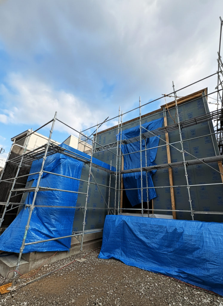 シャープな1号地に対し、2号地が目指したのは**「素材の調和と温もり」**です。住宅の顔となる正面部分に、あたたかな木目と、重厚感のある石の風合いを大胆に組み合わせました。