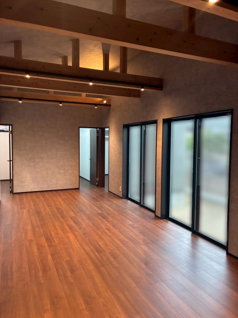 平屋ならではの「高天井」と、力強く横たわる「現し梁」。